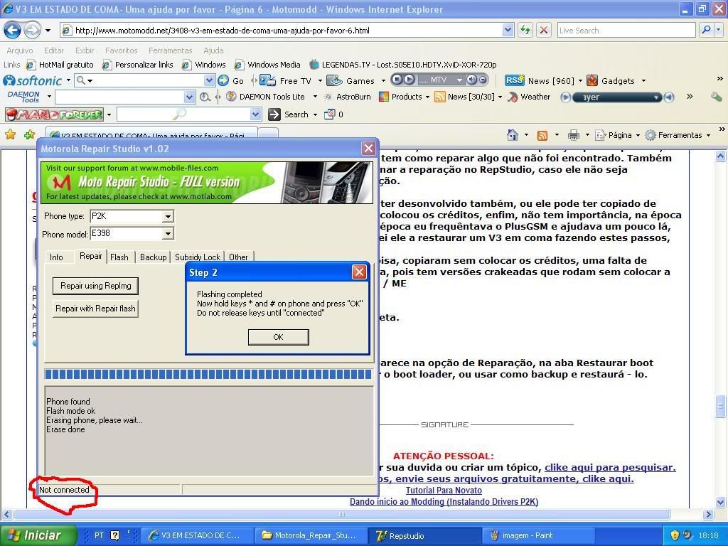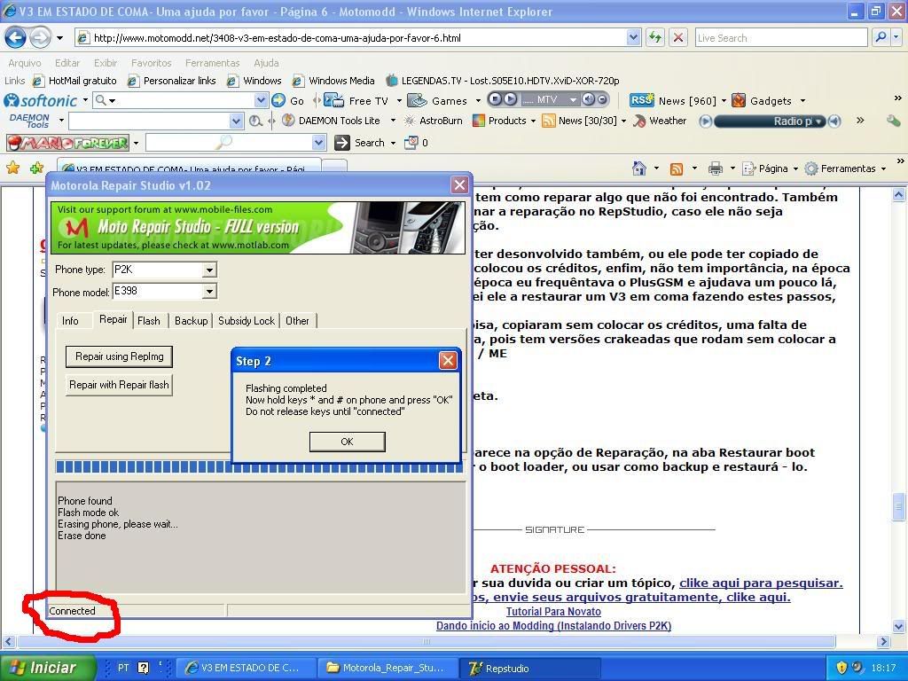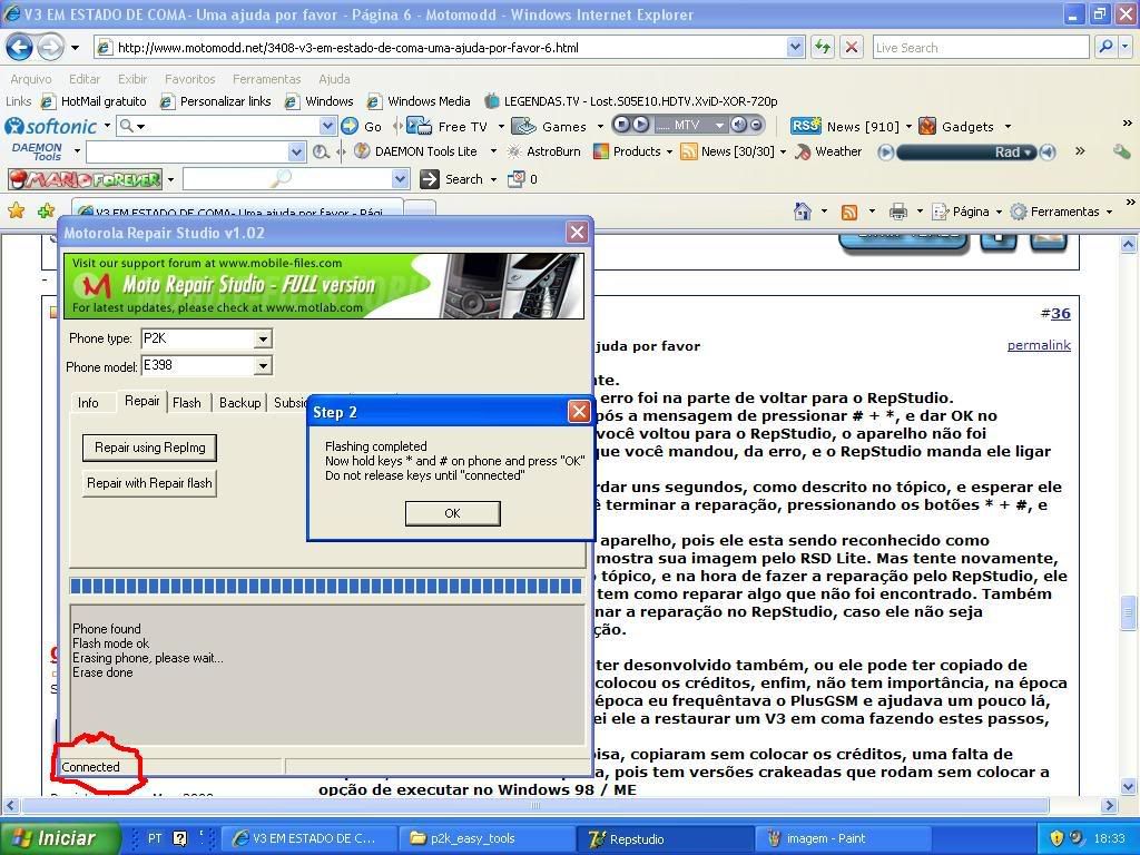 é... acho que não tem jeito, olha só vou postar os últimos passos: Depois de enviar o bootloader 07D0 e seguir os passos do tuto, chega nessa tela: http://i723.photobucket.com/albums/w...ck2_2009/1.jpg certo, ainda está connected. em seguida tiro a bateria e fica assim: http://i723.photobucket.com/albums/w...ck2_2009/2.jpg deixo o repstudio aberto, faço testpoint coloco a bateria e abro o PK2 Easy, seleciono o bootloader 07B0 como mostra nessa imagem abaixo: http://i723.photobucket.com/albums/w...ck2_2009/3.jpg clico em "Do selected jobs" e aparece esta tela confirmando que foi enviado: http://i723.photobucket.com/albums/w...ck2_2009/4.jpg em seguida fecho a tela e retiro a bateria, depois coloco ela novamente sem testpoint no aparelho e fico pressionando #+* aparece a mensagem de que não foi reconhecido e fica la como "Not connected" imagem abaixo: http://i723.photobucket.com/albums/w...ck2_2009/5.jpg Ja ai tenho que fazer o testpoint, retiro a bateria, faço o testpoint e coloco a bateria de novo, pronto no repstudio aparece connected: http://i723.photobucket.com/albums/w...ck2_2009/6.jpg agora de qualquer forma pressiono o *+# e clico em Ok, em seguida carrega uma barra de progresso muito rapidamente e aparece a tela abaixo: http://i723.photobucket.com/albums/w...ck2_2009/7.jpg Send loader failed Repair failed desde que li seu tutorial eu estava fazendo desta maneira e sempre está dando o mesmo problema, o estranho é que o repstudio só anda a barra de progressão quando eu envio a flash reparadora via PK2 Tool e em seguida mando o bootloader 07D0 pelo Rsd lite e fica com as configurações assim: Bootloader Version: v0x000200 Phone Type: Engineering(F0020000000006C4E076190C0B11) só dessa forma que o repstudio funciona, ja tentei diversas vezes fazer o mesmo procedimento e sempre da a mesma coisa. e agora Guinho, o que faço? ![]() Abraço. PS: desculpa pelo post grande mas queria explicar detalhadamente o processo que fiz para ficar o mais claro possível. PS2: ah, em relação a ele ser reconhecido como Engineering, sempre reconheceu assim desde que apagou pela primeira vez. |